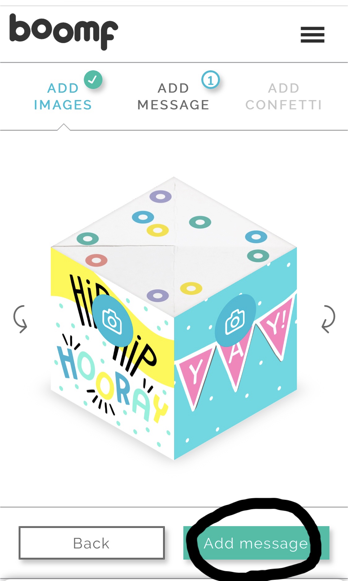 6.側面に写真を追加したら Add message をタップ