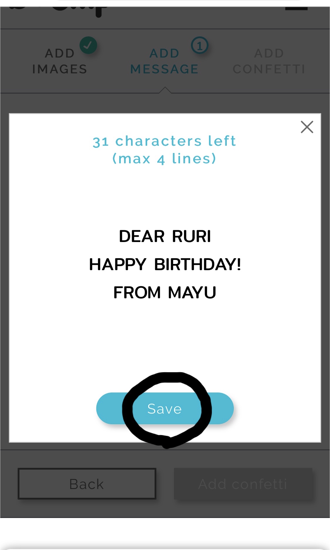 7.好きなメッセージを入力して Save をタップ